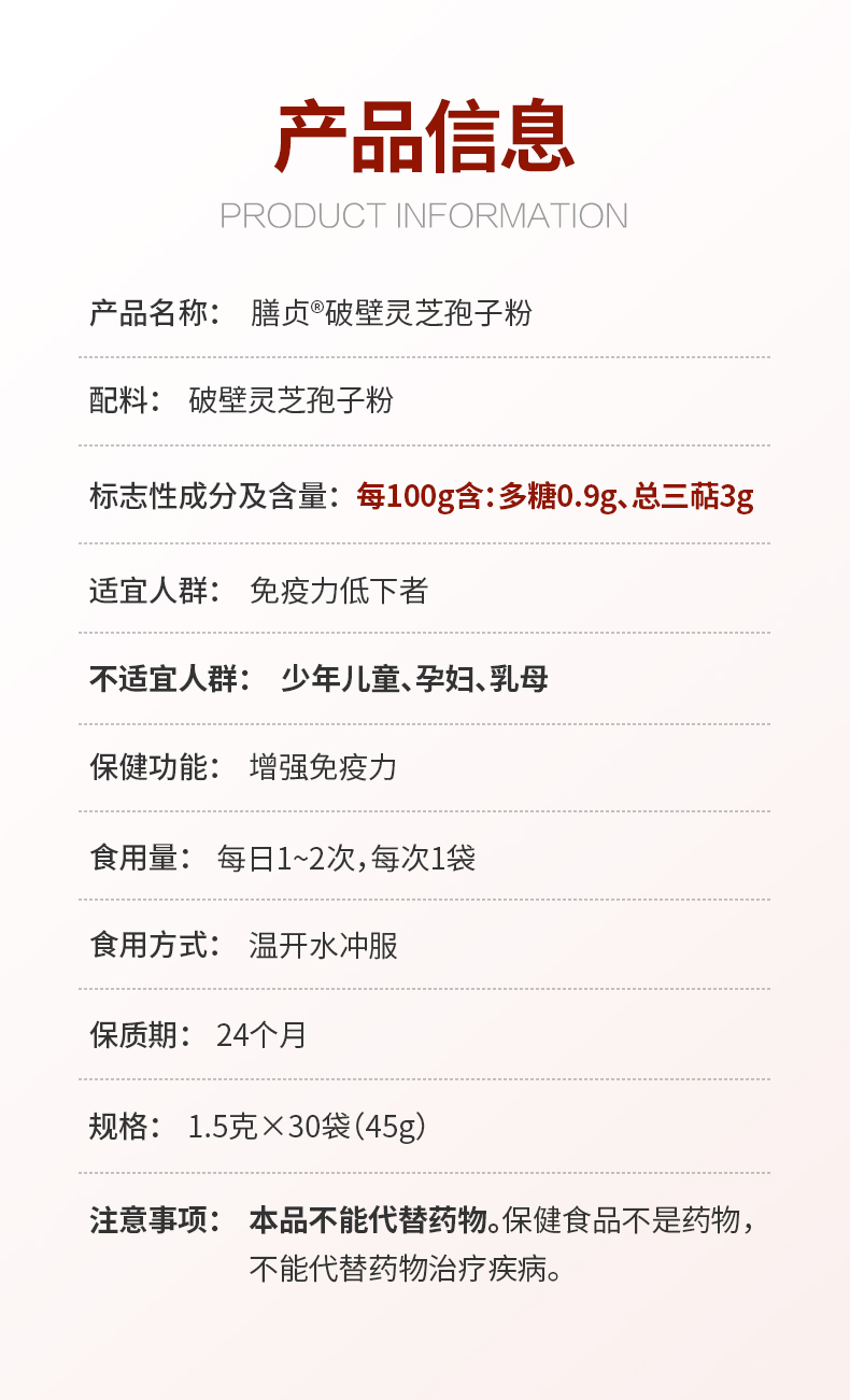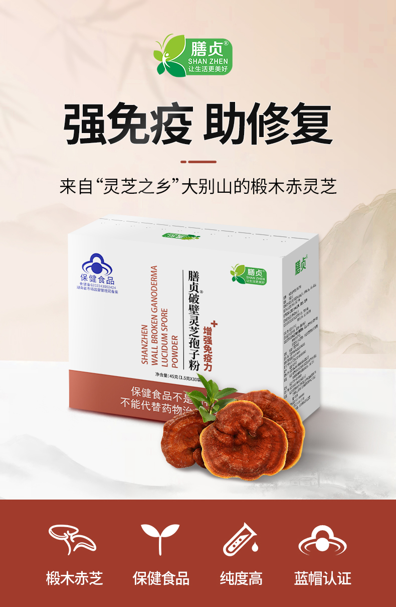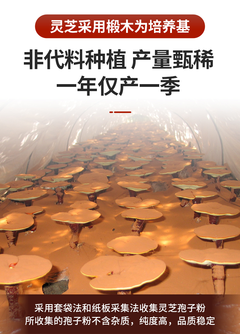 Through advanced wall-breaking technology, the cell wall of the spores is broken so that its nutrients can be fully released and absorbed by the body. It is rich in Ganoderma lucidum polysaccharides, Ganoderma lucidum triterpenes and other active ingredients, which have the effect of enhancing immunity, regulating sleep, and delaying aging.